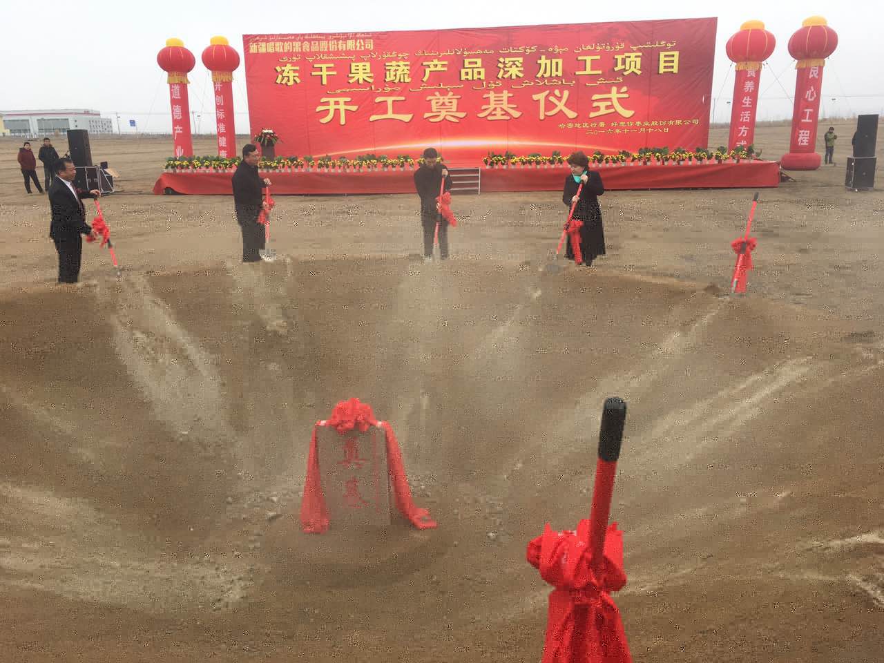 11月18日上午,88体育投资1.5亿元建设冻干果蔬产品深加工项目——新疆唱歌的果食品股份有限公司开工奠基仪式在新疆维吾尔自治区哈密高新技术产业开发区北部新兴产业园举行,新疆维吾尔自治区政协党组副书记、常务副主席白志杰、河南省副省长王铁、地区行署专员祖穆热提·吾布力等领导参加奠基仪式。