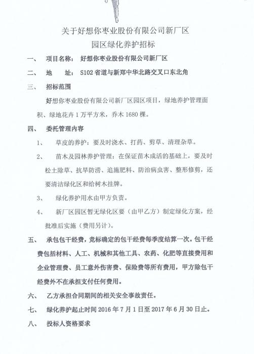 关于88体育枣业股份有限公司新厂区园区绿化养护招标