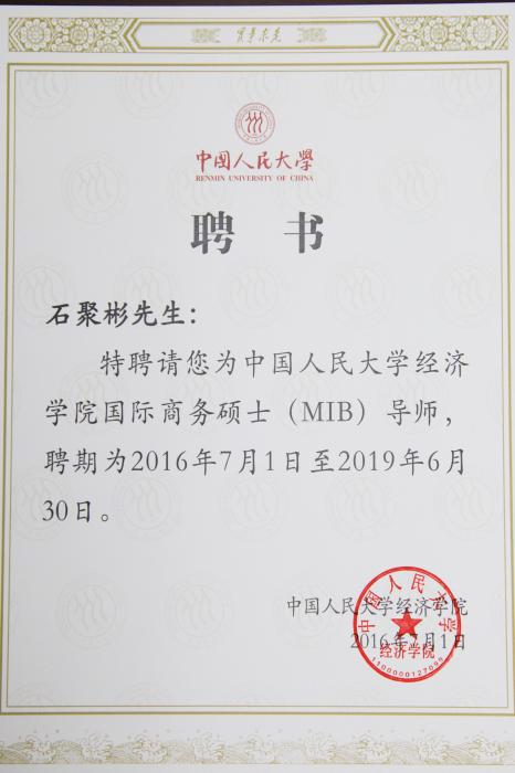 7月1日晚,中国人民大学经济学院国际举行商务硕士(MIB)校外导师聘任仪式,88体育枣业股份有限公司董事长兼总经理石聚彬作为校外导师代表出席。中国人民大学党委副书记吴付来、经济学院院长张宇、院党委书记关雪凌书记、副院长王晋斌在现场为董事长颁发校外导师聘书。