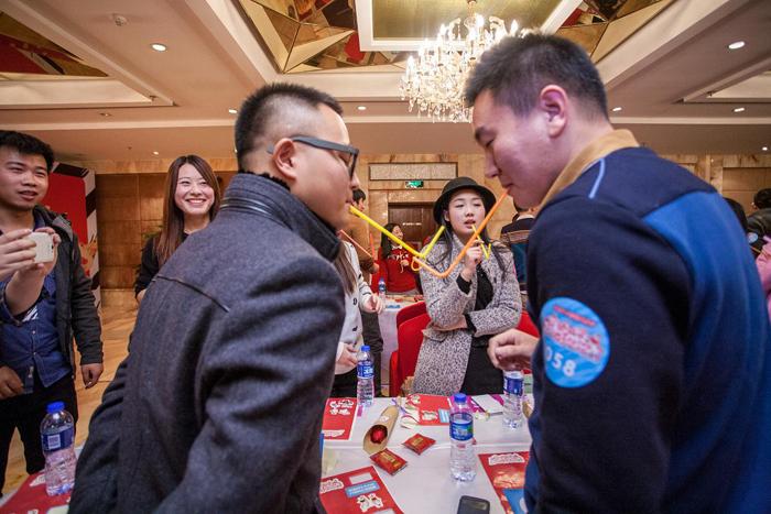 简单的热场之后,又是好玩的“传递吸管”游戏,现场的男女嘉宾被分成5队,每队各20位男生、20位女生,每位嘉宾都领到一根吸管,将吸管咬在嘴里,从最边上的嘉宾开始依次传递一根彩色皮筋。为了吸引心仪异性的注意,游戏过程中,每位嘉宾都使出了浑身解数。